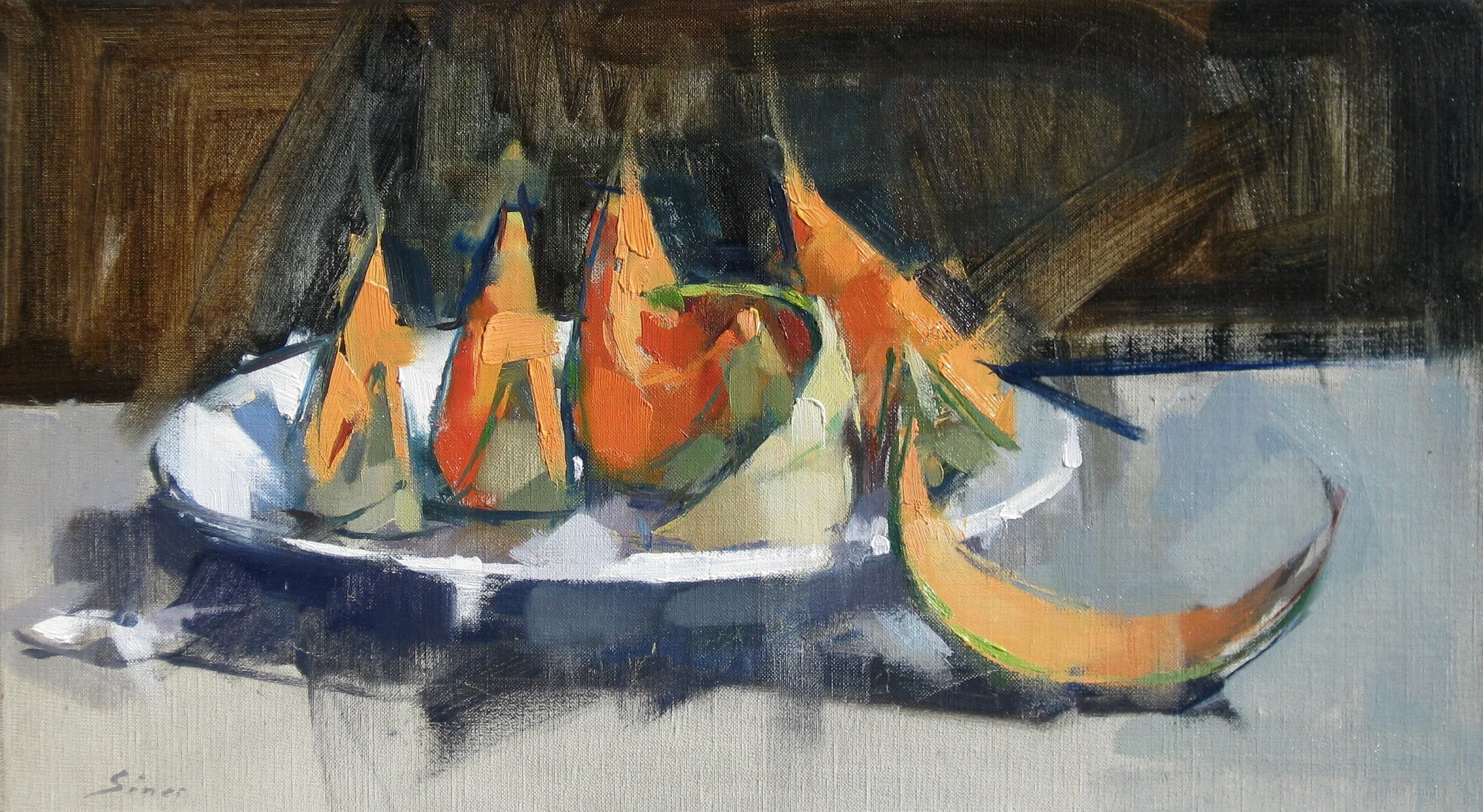 Maggie Siner is an American artist whose paintings are shown in Paris, Venice, London, New York, Washington DC, and in hundreds of collections around the world. Born in Providence, Rhode Island, she began her studies at the Art Students League of New York, graduated from Boston University (BFA) and American University (MFA) where she studied with Robert D’Arista. During her long artistic career she has lived for extended periods in France, China and Italy. Siner’s work is classically derived and highly structured while also being gesturally expressive. She works directly from visual perception, trying to catch vision ‘in the act’,focusing on light and the everyday world of objects and transience.